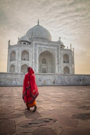 A woman dressed in a flowing red outfit stands gracefully in front of the Taj Mahal, her vibrant attire contrasting with the monument’s white marble elegance. The scene captures a striking blend of cultural beauty and architectural grandeur, evoking a sense of timeless wonder.