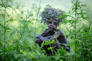 A Suri boy from Ethiopia’s Omo region adorns himself with brightly colored flowers and body paint, a tradition during special occasions.