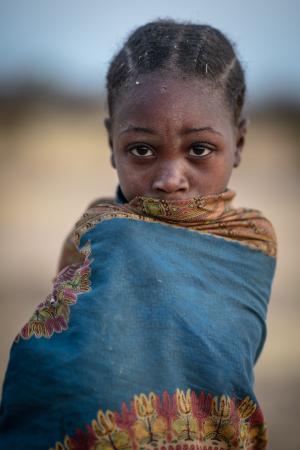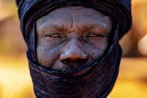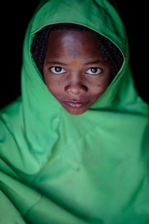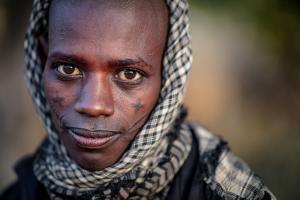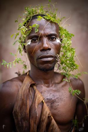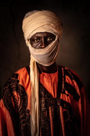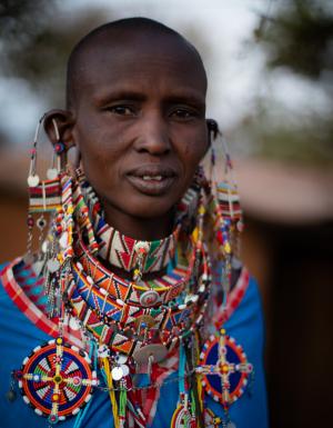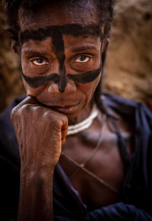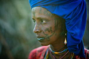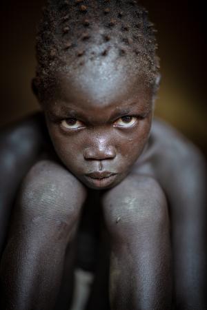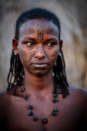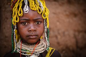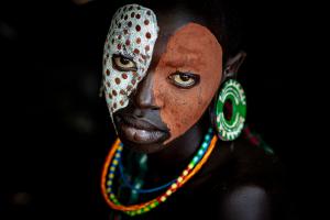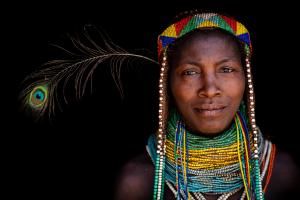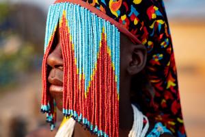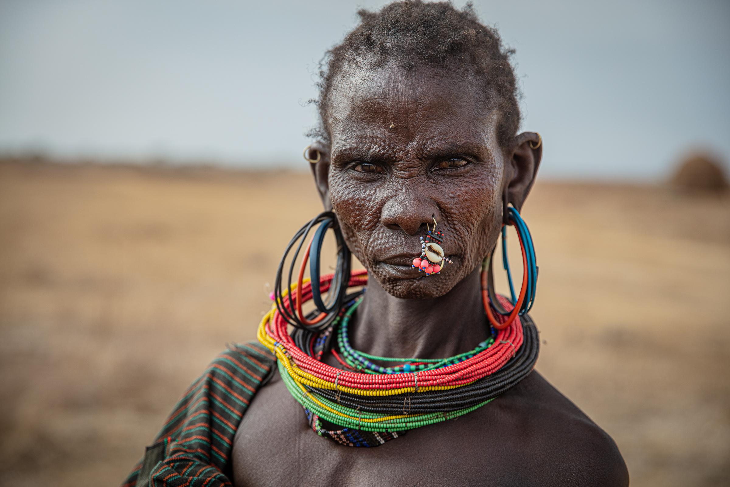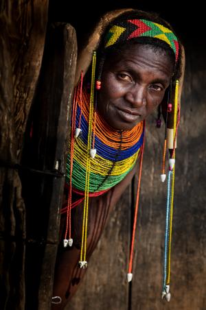 The Jiye are fierce warriors. They pierce and scar their bodies as marks of beauty. The women wear beaded head bands in colors which represent the clan of their husband.